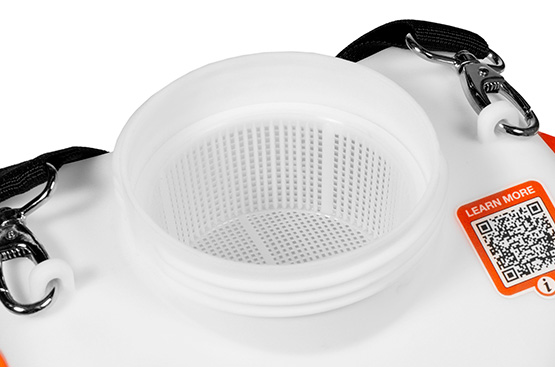 Широкая горловина опрыскивателя делает наполнение бака очень удобным, а установленный на ней фильтр грубой очистки предотвращает попадание крупных частиц в бак и защищает насос от повреждения.